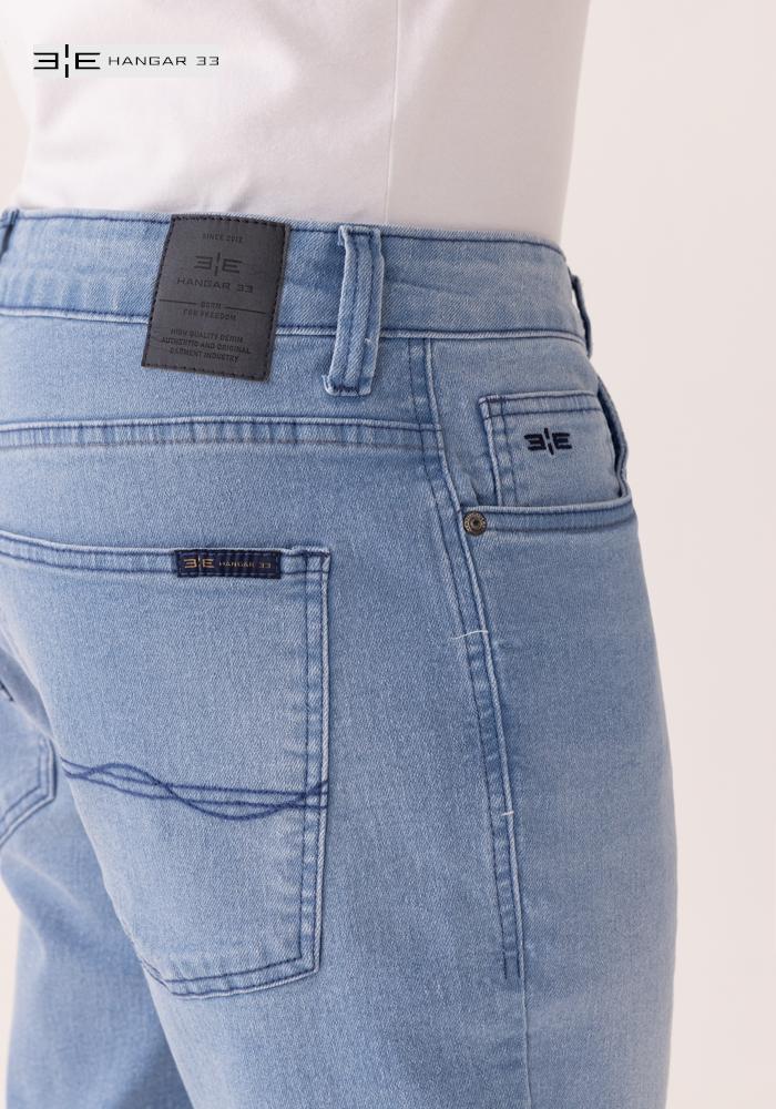 Feita em jeans com elastano ,40% de elasticidade, modelagem reta radial, bolsos funcionais, passantes no cós, fechamento por botão e zíper.